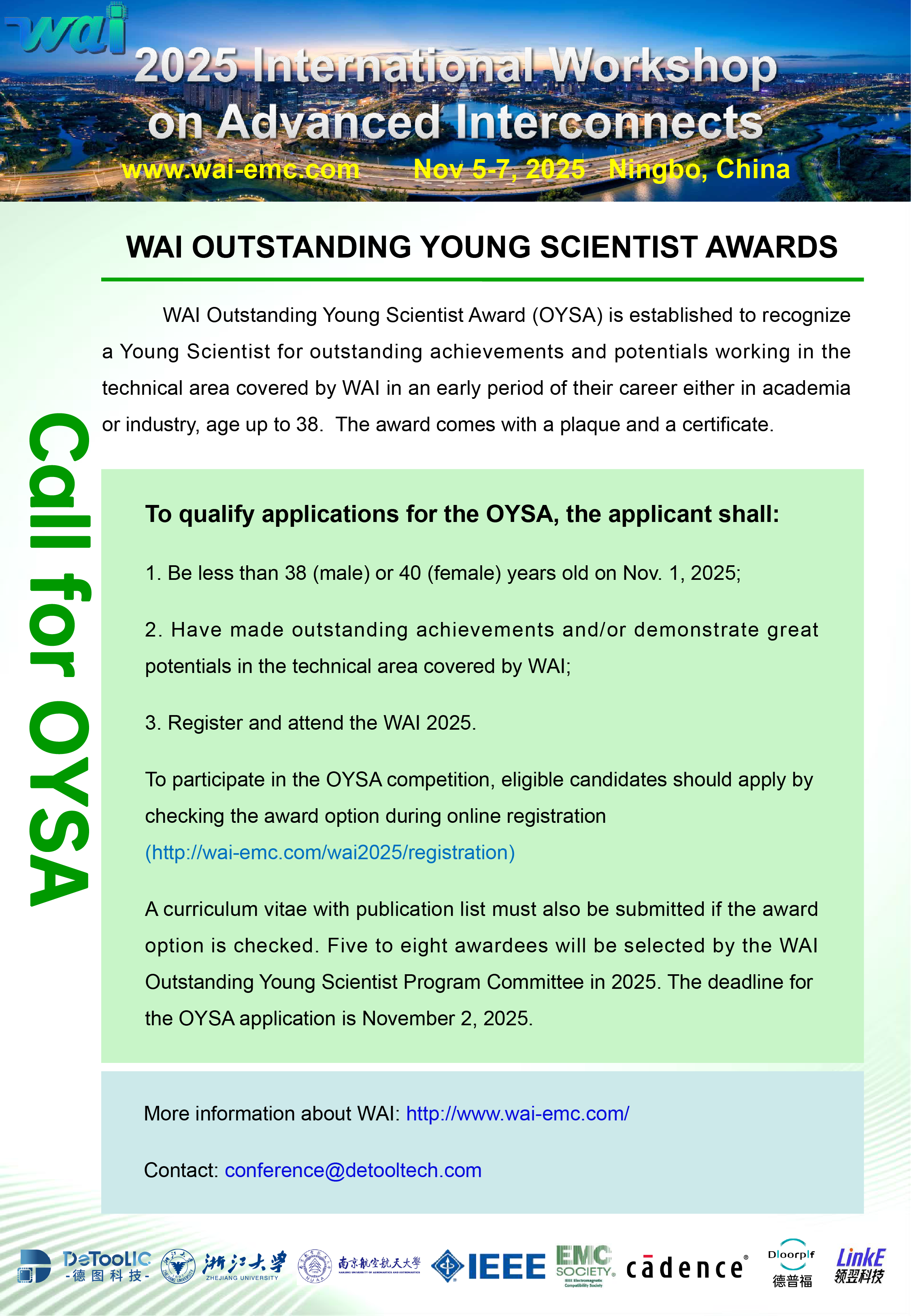 WAI Outstanding Young Scientist Award (OYSA) is established to recognize a Young Scientist for outstanding achievements and potentials working in the technical area covered by WAI in an early period of their career either in academia or industry, age up to 38. The award comes with a plaque and a certificate.